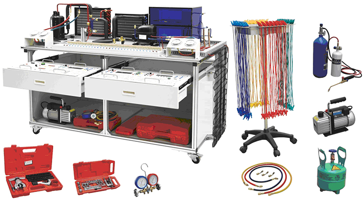1、實(shí)訓(xùn)臺(tái)采用鋁型材臺(tái)架加實(shí)訓(xùn)模塊結(jié)構(gòu),裝置采用一體化設(shè)計(jì),由導(dǎo)軌式鋁合金安裝平臺(tái)、空調(diào)系統(tǒng)、電冰箱系統(tǒng)、電氣控制系統(tǒng)等組成。底部安裝有四個(gè)帶剎車的腳輪,可以方便的移動(dòng)和固定。設(shè)備配置空調(diào)制冷系統(tǒng)管路1套、直冷電冰箱制冷系統(tǒng)管路1套、安全插端子排,壓力表(1.5MPa)2只(3.5 MPa)2只等。