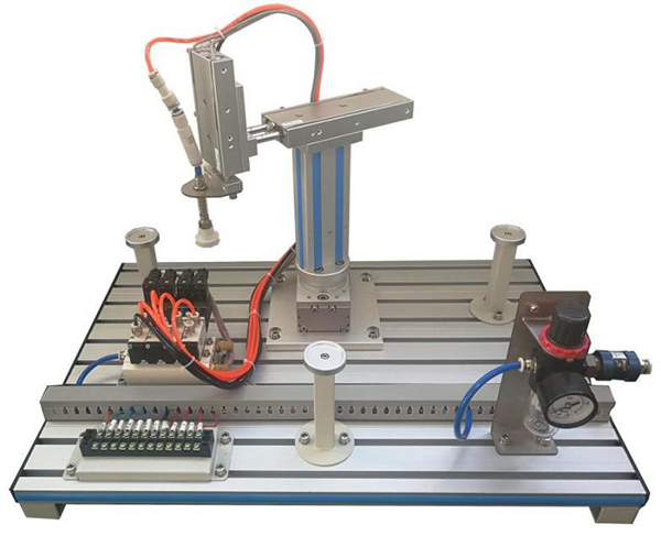 模型由回轉(zhuǎn)氣缸、雙軸氣缸、單軸氣缸、吸盤、真空發(fā)生器、電磁閥、節(jié)流閥、手滑閥、減壓閥、磁性開關(guān)、機械部件、工業(yè)鋁合金型材底板等組成,設(shè)有兩個抓取工位,可進(jìn)行工件取放控制練習(xí)?砷_展對氣動機械手的操作及編程控制訓(xùn)練。配有空氣壓縮機:靜音無油,工作電源AC220V±10% 50Hz,輸入功率0.68kW;公稱容積24L,理論流量:116L/min,額定輸出氣壓0.7MPa。