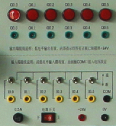 提供6路輸入、6路輸出等接口,輸入、輸出端電壓可自由切換0V和24V,輸出端由指示燈的亮滅來指示PLC輸出口的狀態(tài),面板印有清晰的說明和端口絲印。通過基本指令練習(xí),讓學(xué)生掌握PLC輸入、輸出的外圍接線和工作原理。