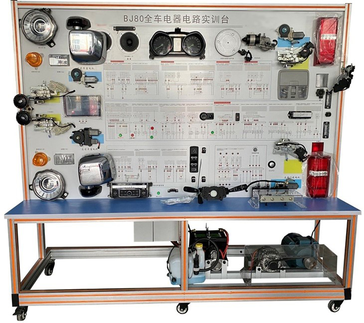 該設(shè)備采用全新BJ80 2.3T整車電器實(shí)物為基礎(chǔ),充分展示汽車發(fā)動(dòng)機(jī)防盜系統(tǒng)、儀表系統(tǒng)、燈光系統(tǒng)、雨刮系統(tǒng)、喇叭系統(tǒng)、點(diǎn)火系統(tǒng)、電動(dòng)車窗系統(tǒng)、電動(dòng)門鎖、音響系統(tǒng)、起動(dòng)系統(tǒng)和充電系統(tǒng)等汽車電器各系統(tǒng)的組成結(jié)構(gòu)和工作過程。