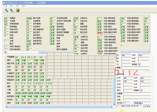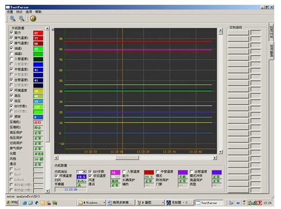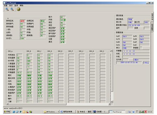 中央空調(diào)機由于工程復(fù)雜,設(shè)備分散,有的已經(jīng)裝修在開花板上測試程序,一但出現(xiàn)了故障,工程量相當(dāng)大,為了能夠快速準(zhǔn)確地測出故障是由主機機組還是室內(nèi)機的故障的,每個生產(chǎn)廠家根據(jù)生產(chǎn)的和維修的需要而開發(fā)了中央空調(diào)測試程序?蓽y試壓縮機的運轉(zhuǎn)頻率,傳感器的各種數(shù)據(jù),電子膨脹閥的工作步數(shù)等幾十種中央空調(diào)的工作數(shù)據(jù)和狀態(tài),軟件可實現(xiàn)對內(nèi)機的控制,,可以對1-64臺內(nèi)機的狀態(tài)進(jìn)行設(shè)定。是高校提供了好的研究的學(xué)習(xí)設(shè)備。