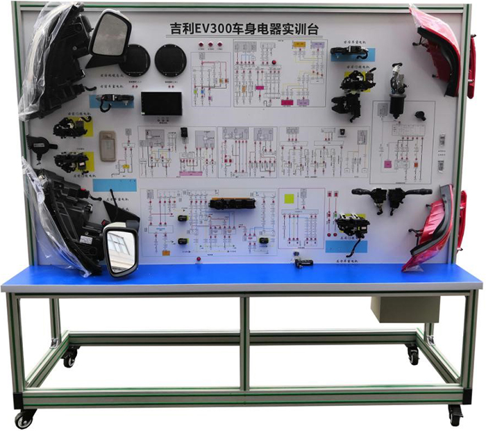 車身電腦、儀表、左前車窗電機(jī)、右前車窗電機(jī)、左后車窗電機(jī)、右后車窗電機(jī)、左前鎖塊、右前鎖塊、右后鎖塊、左后鎖塊、電源總開關(guān)、保險(xiǎn)絲盒、車窗組合開關(guān)、中控鎖開關(guān)、組合開關(guān)、左右前大燈總成、左右前霧燈、左右轉(zhuǎn)向燈、左右組合尾燈、牌照燈、燈光開關(guān)、倒車燈開關(guān)、危險(xiǎn)燈開關(guān)、剎車開關(guān)、雨刮總成、雨刮開關(guān)、雨刮繼電器、洗滌電機(jī)、喇叭、喇叭開關(guān)、電動(dòng)后視鏡與開關(guān)、音響與導(dǎo)航總成、音響揚(yáng)聲器(6寸200W)、DC12開關(guān)電源、點(diǎn)火開關(guān)、一體化全鋁合金型材搭建的移動(dòng)臺架(2040×650×1800mm (帶自鎖腳輪裝置,帶安裝檢測端子的原理面板,面板1988×1220mm)、故障設(shè)置和考核系統(tǒng)、設(shè)備操作說明書。