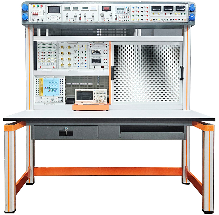 實驗桌后面二支桌腳向上延伸,配上特制拉模成型的帶滑槽橫梁鋁型材組成實訓(xùn)屏,實訓(xùn)時左邊放置電氣實訓(xùn)掛箱(2層)及示波器支架,右邊裝置網(wǎng)孔板等,實訓(xùn)掛箱、網(wǎng)孔板在實訓(xùn)屏上實訓(xùn)時上下方便,左右移位自如。實訓(xùn)屏頂部安裝主機箱,實訓(xùn)屏底部安裝實驗儀器工作電源箱。