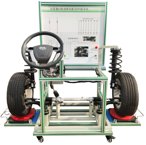 動力轉向控制電腦(ECU)、診斷座、點火開關、前橋懸掛機構、方向盤、轉向柱、電動助力方機、轉向拉桿、前左右車輪總成、信號模擬裝置、扭矩傳感器、扭矩傳感器信號電壓數顯表、故障模擬與排除裝置、前輪左右轉盤、一體化全鋁合金型材搭建的移動臺架(1500×1000×1700mm ,帶自鎖腳輪裝置,帶安裝檢測端子的原理面板948×898mm)、設備操作說明書。