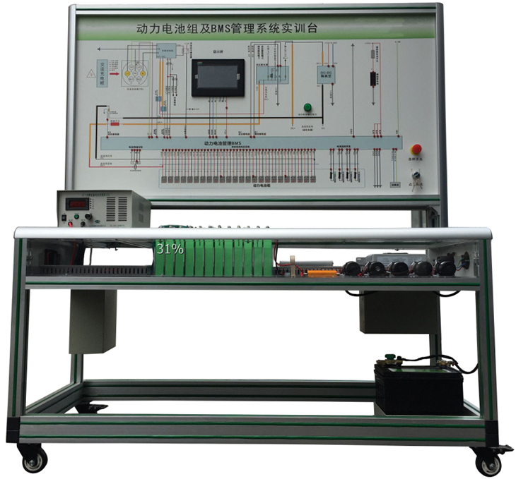 磷酸鐵鋰動力電池包與鐵制電池箱(單體電池3.2V 20AH,24串)、BMS鋰電管理一體機(jī)、動力電池包觸摸顯示屏、車載充電機(jī)、國標(biāo)充電插口、國標(biāo)充電槍、緊急斷電開關(guān)、霍爾電流傳感器、直流接觸器(包含充電繼電器、總正繼電器、總負(fù)繼電器、預(yù)充繼電器)、DC-DC轉(zhuǎn)換器(72V-12V30A)、輔助蓄電池(12V45AH)、放電控制繼電器與放電負(fù)載電阻、預(yù)充電阻器、可移動實訓(xùn)臺(1500×700×1700mm 帶自鎖腳輪裝置,帶安裝檢測端子的原理面板,面板1448×940mm)、故障模擬與排除裝置、設(shè)備操作說明書。