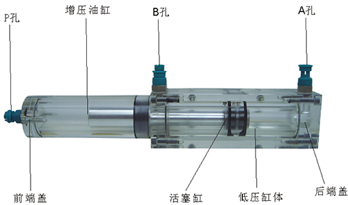 2、增壓油缸的前端、后端蓋、低壓缸體、增壓缸體等均采用了進(jìn)口透明有機(jī)玻璃材料精制而成,透明清晰,活塞桿采用了合金鋁材料,并配合油接頭,密封圈,內(nèi)六角螺絲等標(biāo)準(zhǔn)件裝配而成,通過它可明確地觀察到活塞桿,油封,油孔等結(jié)構(gòu)及其運(yùn)行過程,具有形象逼真,性能可靠等優(yōu)點(diǎn),它既可作為教學(xué)模型,也可以液壓實(shí)驗(yàn)元件進(jìn)行實(shí)驗(yàn)演示。