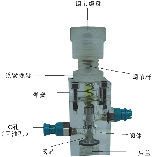 2、溢流閥結(jié)構(gòu)上參考了國產(chǎn)P-63B型低壓直動(dòng)式溢流閥,其閥體閥蓋、鎖緊螺母、調(diào)節(jié)螺母、螺塞等采用了進(jìn)口透明有機(jī)玻璃材料精制而成,閥芯、調(diào)節(jié)桿采用了45#中碳鋼材料。并配合彈簧,油接頭,密封圈等標(biāo)準(zhǔn)件裝配而成,通過它可明確地觀察到閥芯、彈簧、油孔等結(jié)構(gòu)及其運(yùn)行過程,具有形象逼真,性能可靠等優(yōu)點(diǎn)。它即可作為教學(xué)模型,也可以作為液壓實(shí)驗(yàn)元件進(jìn)行實(shí)驗(yàn)演示。