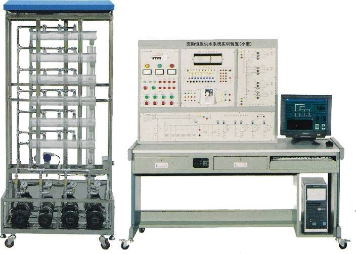 變頻恒壓供水系統(tǒng)實訓裝置,集PLC、變頻調速、過程控制、工程組態(tài)技術于一體。它由六層住宅消防、生活供水系統(tǒng)(實物模型),控制平臺兩大部分組成,包含了可編程控制器、變頻器、變頻磁力驅動泵、休眠泵、消防泵、壓力變送器、壓力儀表、輸水管道、消防栓、家用水龍頭、蓄水池等工程設備?刂破脚_采用PLC+變頻器的開放式控制結構,可以完成多種模式下的樓層恒壓供水實訓實訓,為教學研究變頻恒壓供水技術提供一個開放的操作平臺。它是一款適合于大學及中、高職院校電氣自動化、樓宇自動化、建筑電氣、智能建筑等專業(yè)的綜合型技能實訓考核設備。