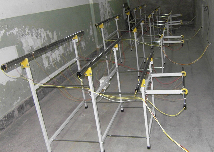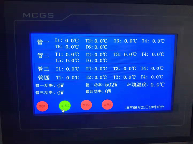 配有四根不同長度和直徑的電鍍紫銅管,管內(nèi)設(shè)置電加熱器;每根管子的表面裝4~6支測溫傳感器,以測定其表面平均溫度,測溫傳感器采用進口DS18B20;每根橫管電加熱器配備電子集成固體調(diào)壓模塊無機調(diào)節(jié)。測試儀表箱設(shè)有(每根橫管電加熱器)數(shù)顯功率表;所有測試數(shù)據(jù)由7寸觸摸屏同屏顯示,不銹鋼實驗支架。